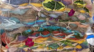 Hand dyed sheep and alpaca fleece, flax, linen yarn, foliage and flowers from our own gardens made very individual wall
