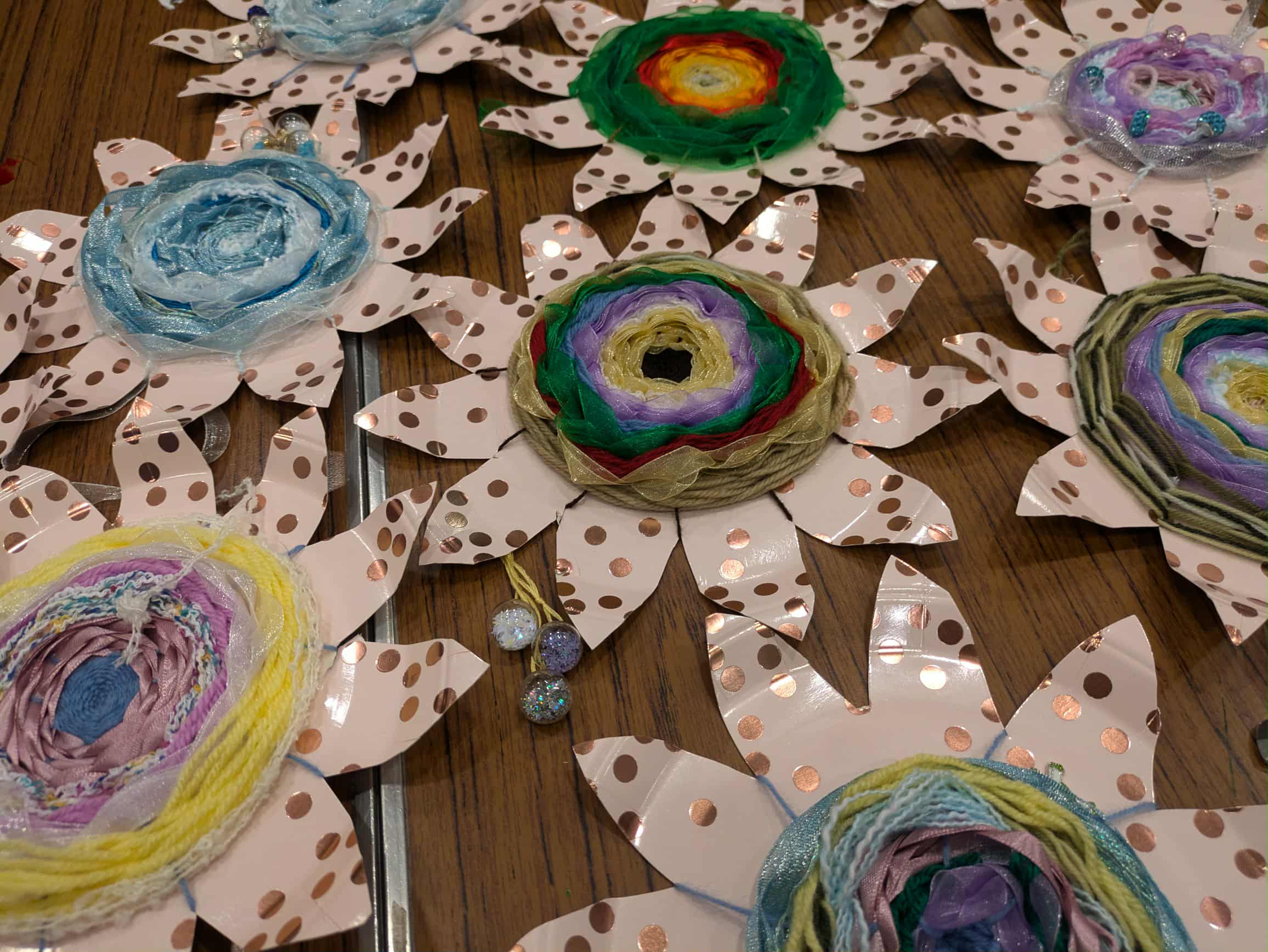 In this workshop we will use paper plates as a weaving frame to make Christmas stars for the top  of your Christmas tree. We will use ribbons, beads and charms to make the stars.